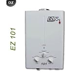 The EZtankless Model EZ 101 is aesthetically pleasing and has simple design features that make this outdoor unit easy to use and install as well as unobtrusive if located within view of working or living spaces.We are the seller who tells you the straight-up honest truth. Don't be deceived by others who market similar heaters, this type of draft unit is not for indoor mounting in a residence! This unit will operate on a standard LP (propane) tank as used with barbecue grills. No electrical plug-in is required, making this LP model ideal for use by outdoorspersons during hunting or camping expeditions, or you may choose to use this heater for semi-permanent installations at long term camp sites, small lake homes or cabins, open shelters, barns, workshops and sheds, or any open area with excellent ventilation. Or for those who live in remote rustic cabins and homes with one bath. The intake air is pulled from all around the casing keeping the unit very cool to the touch. For example; As tested in our USA laboratory, this unit can easily operate via a garden hose inlet water supply.This "No pilot light" design is safe and convenient, using automatic ignition to further your energy savings. Convenient for areas where electricity may not be available. The ignition electrical source is supplied by two long lasting "D" cells (not included).